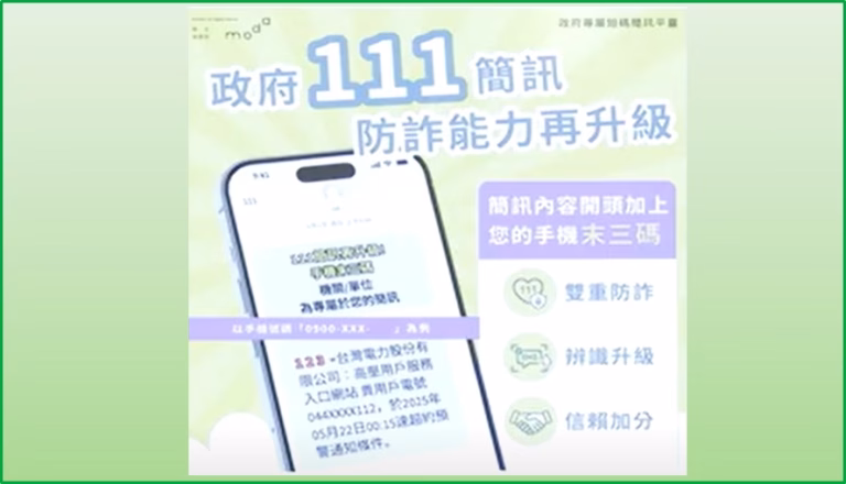 為防堵詐騙集團假冒政府名義發送簡訊,數位發展部自6月起,強化「111 政府專屬短碼簡訊平臺」防詐識別機制,訊息開頭將新增接收者手機號碼末3碼及機關名稱,藉由「來源號碼」、「手機末三碼」與「機關具名」三重驗證,快速提高辨識真偽,強化社會對政府的資訊信任與防詐安全。